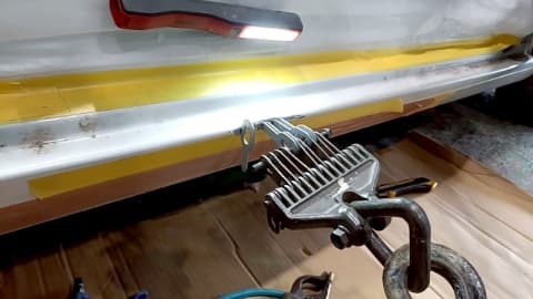 ▼ サイドシルの凹みを修正したらパテを盛り付けて平滑にします。