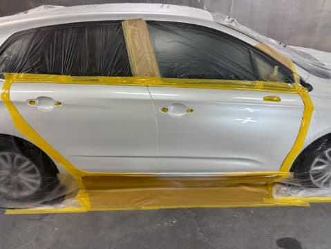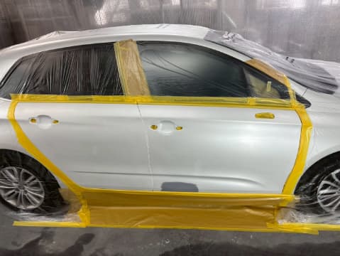 フロントドアとリアドアを塗装前の下地処理としての足付けと塗装面の脂分を落とす脱脂の作業もします。