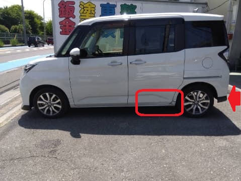 ▼ 左リアドアからリアバンパーにかけての損傷となります。