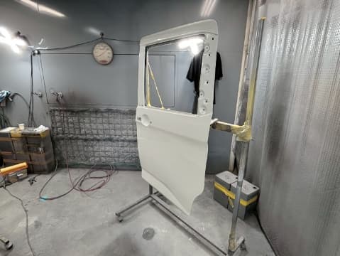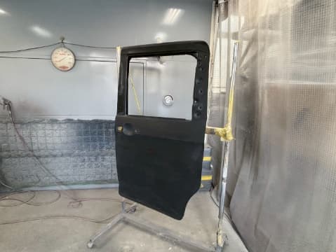 ▼ 新品のリアドアが入庫しました。新品のパネルは非常に高い防錆力を持つ電着塗装が施されて供給されます(殆んどの場合黒い塗装膜)ので現車の色に合わせて塗装をしていきます。