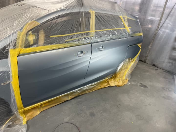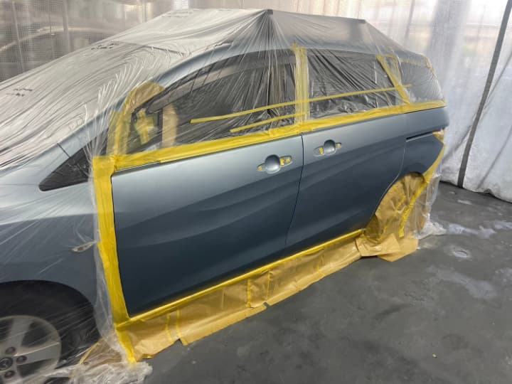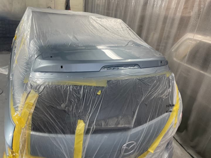 その後車を塗装ブースに移動して、車全体を塗料の飛散による汚れ防止のため専用のビニールシートによるマスキング養生をします。
