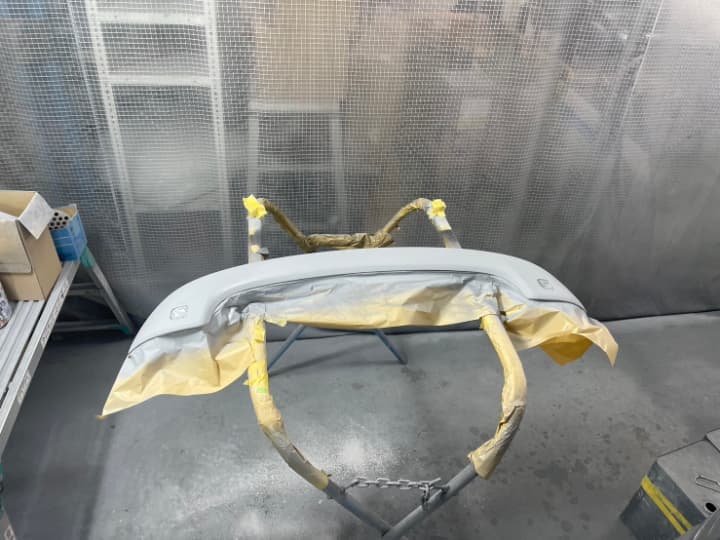 ▼ 同じようにスポイラーもクリア剥がれの塗膜を剥がして、足付けと脂分・ワックス分を専用の溶剤で落とす脱脂を行いサフェーサを塗布します。